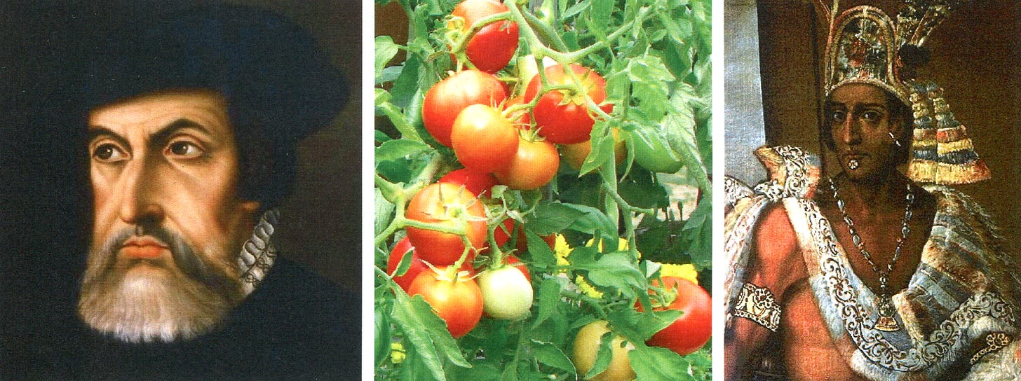 But for the people in Southern Italy tomatoes became a much-loved gift from Spain. There they were called tomate, from the Aztec tomatl. It was the famous Spanish explorer, Hernan Cortez, who discovered tomatoes growing in Montezuma’s garden in 1519. Very shortly afterwards Cortez killed Montezuma along with thousands of his Aztec people and then stole their gold and conquered Mexico for Spain. Not the kind of guy you really want to have over for dinner. But the Spaniards did introduce the rest of the world to those great foods even if they weren’t so nice about it.