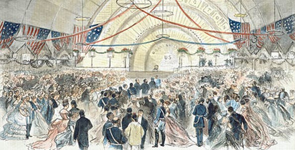 At his first inaugural, President Grant’s White House staff went beyond cucumbers sliced in vinegar and laid out a spread of delicacies which would have amazed Amenhotep, including 138 roasted turkeys, 1,600 pounds of corned beef, 200 hams, 8,000 sandwiches, 2,000 pounds of lobster, 1,800 pounds of chicken salad and hundreds more pounds of cake, ice cream, wine punch and 400 gallons of coffee and tea. And that list is short of the total spread by a good margin.